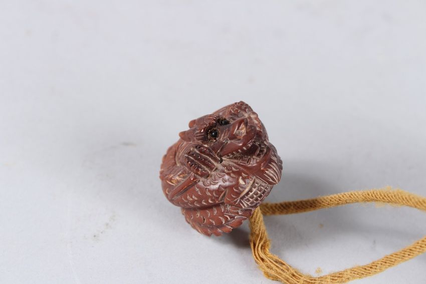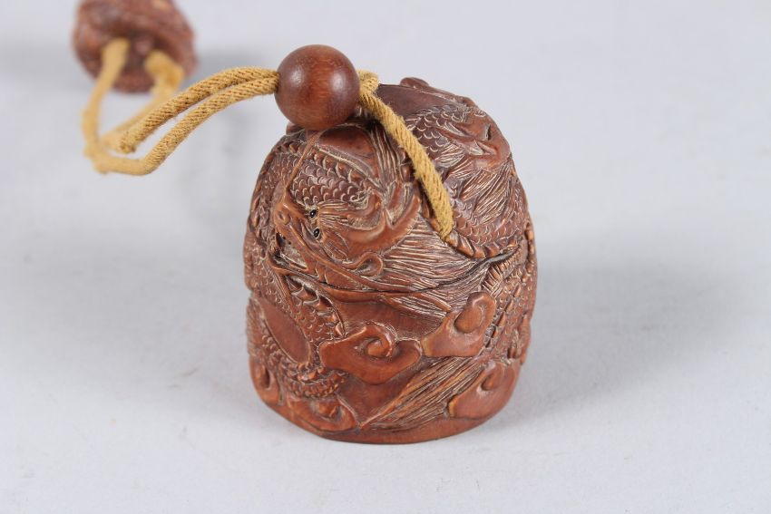 A CHINESE CARVED WOOD INRO on a rope.