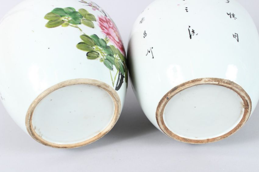 A PAIR OF CHINESE GINGER JARS painted with flowers and birds.
