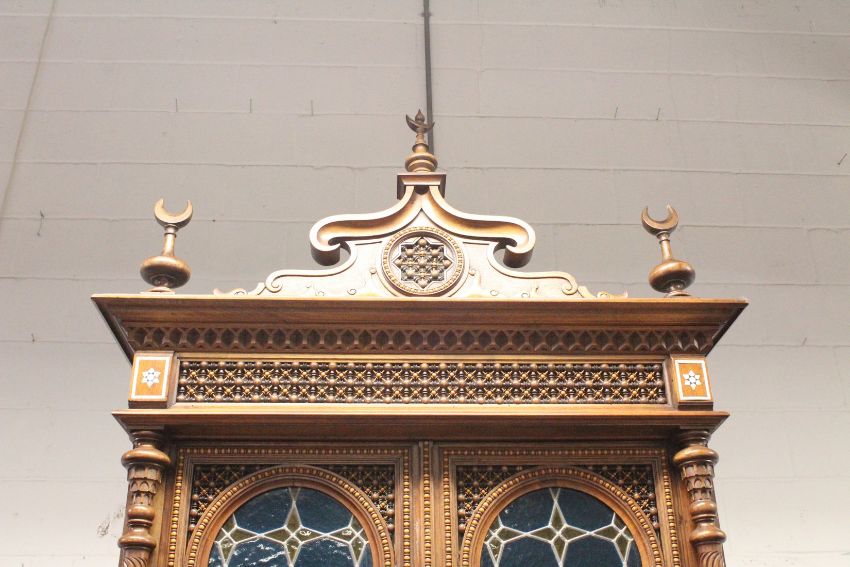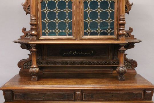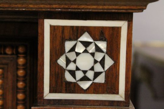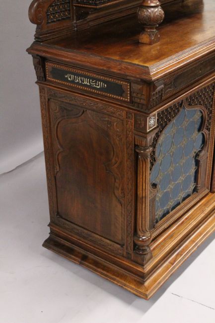 AN IMPRESSIVE ITALIAN OR EGYPTIAN MOTHER-OF-PEARL INLAID HARDWOOD ORIENTAL CUPBOARD in the style of GUISEPPE PARVIS.