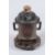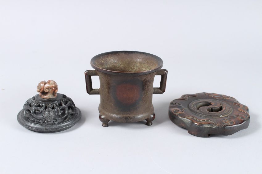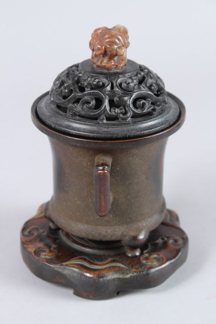 A LATE QING OR EARLY REPUBLIC PERIOD CHINESE BRONZE INCENSE BURNER WITH A TRIPOD BASE. It features a carved hardwood lid with openwork cloud motifs, topped by a soapstone finial shaped like a ruyi. The base is marked "falang".