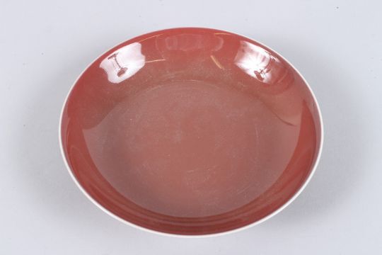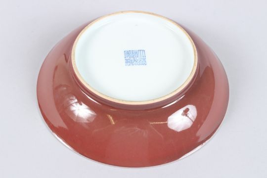 A CHINESE PORCELAIN DISH, with copper red glaze, square seal mark to base.