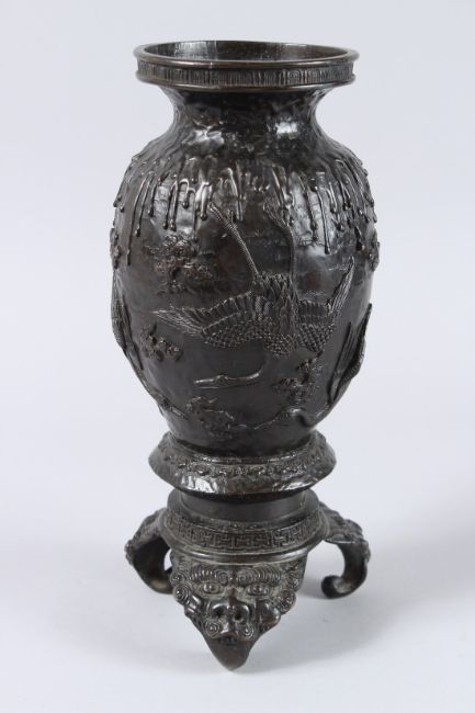 A 19TH CENTURY JAPANESE BRONZE VASE ON STAND, with panels of birds in relief, supported on three lion feet.