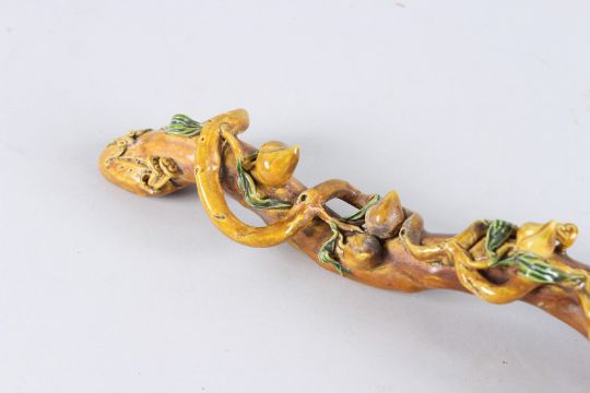 A CHINESE BROWN GLAZED PORCELAIN SCEPTRE.