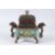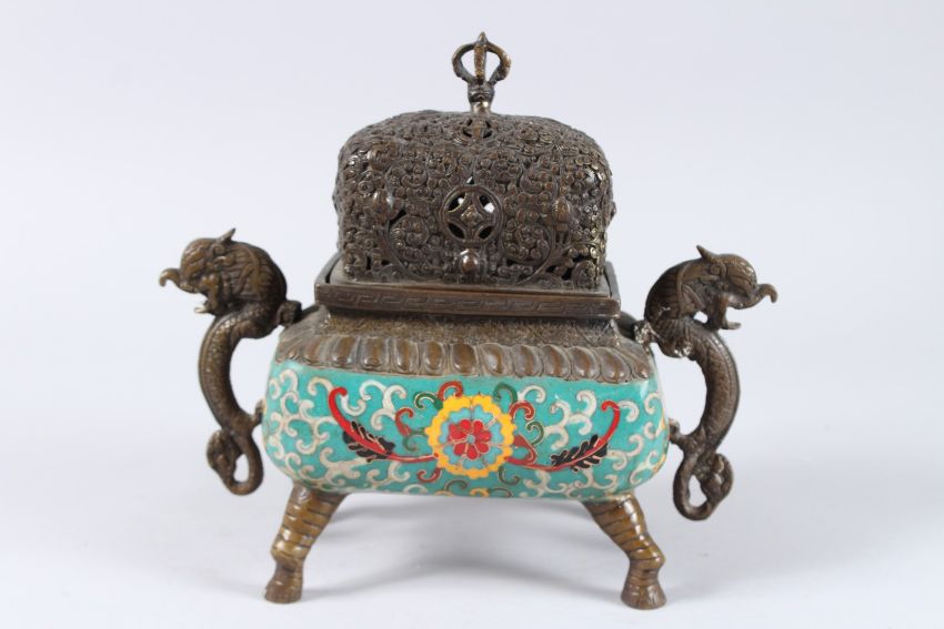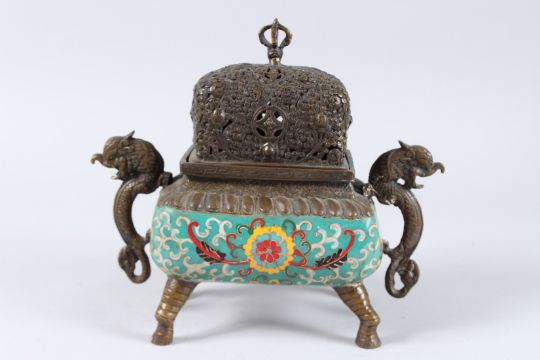 A TIBETAN STYLE INCENSE BURNER, colourful cloisonne enamel decoration on the body, the burner with cover vajra on top.