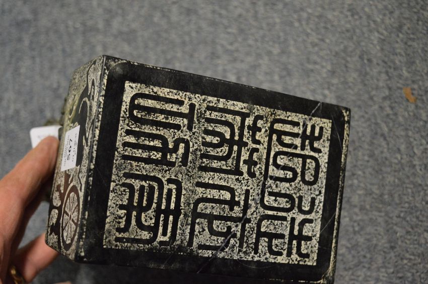 Three large Chinese carved hard stone seals mounted with Buddhistic lions.