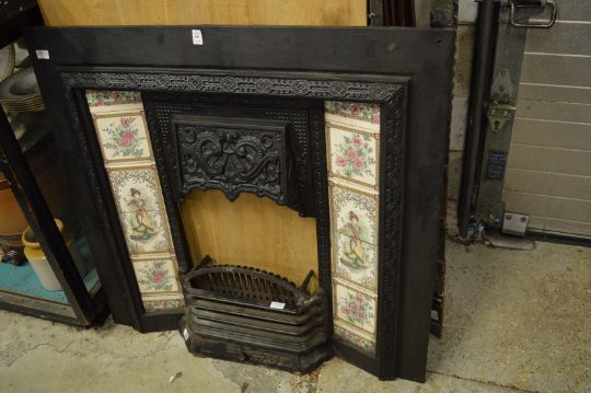 Cast iron fireplace with tile inset panels together with a grate and fender.