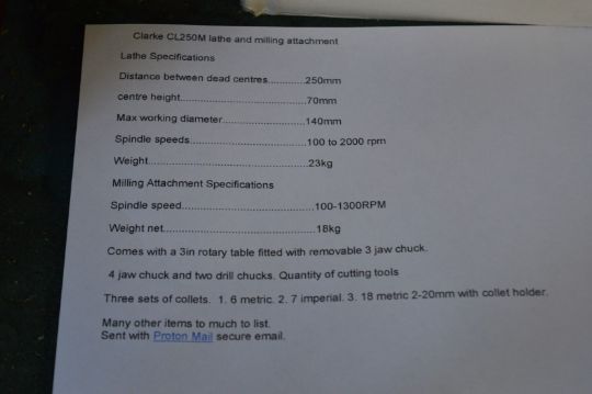 A Clarke CL250M lathe and milling attachment (see online images for further details).