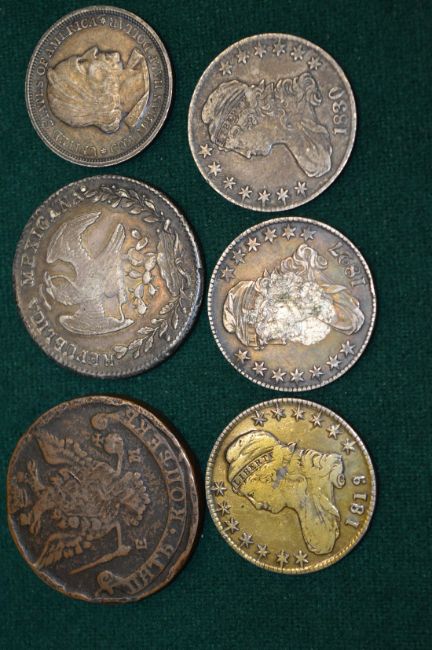 A group of American and other coins to include three early 19th century 50 cent pieces.