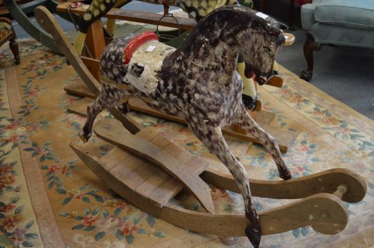 An early painted rocking horse on pine base (faults).
