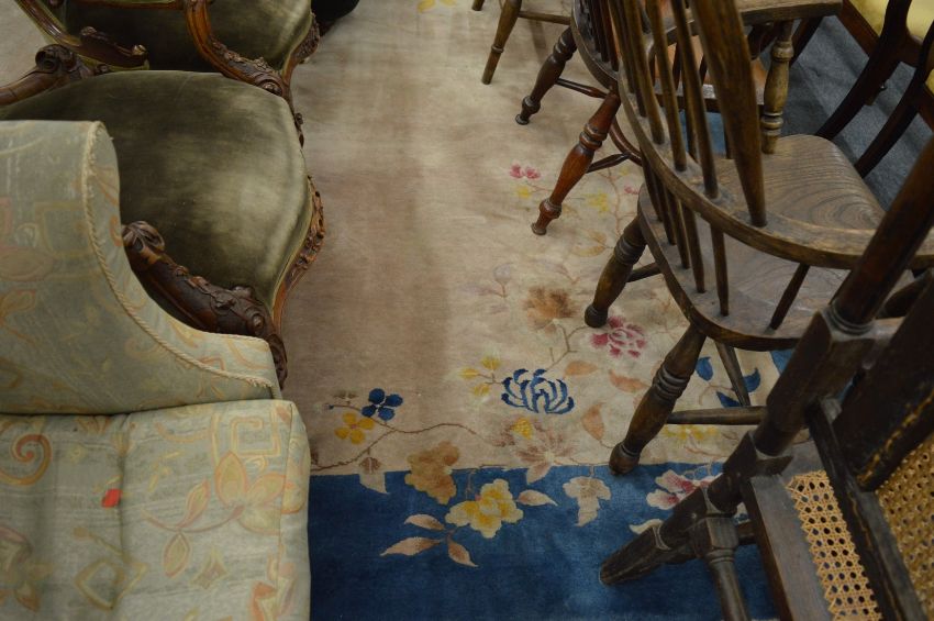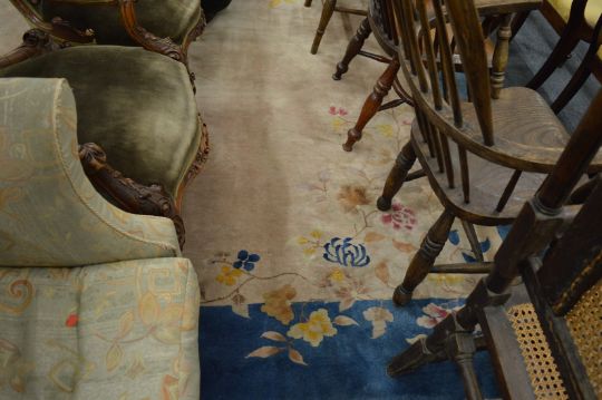 A Chinese carpet, beige ground within a blue border decorated with flowers, 352cm x 270cm.