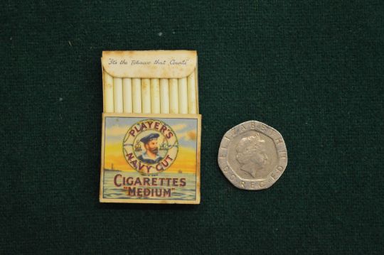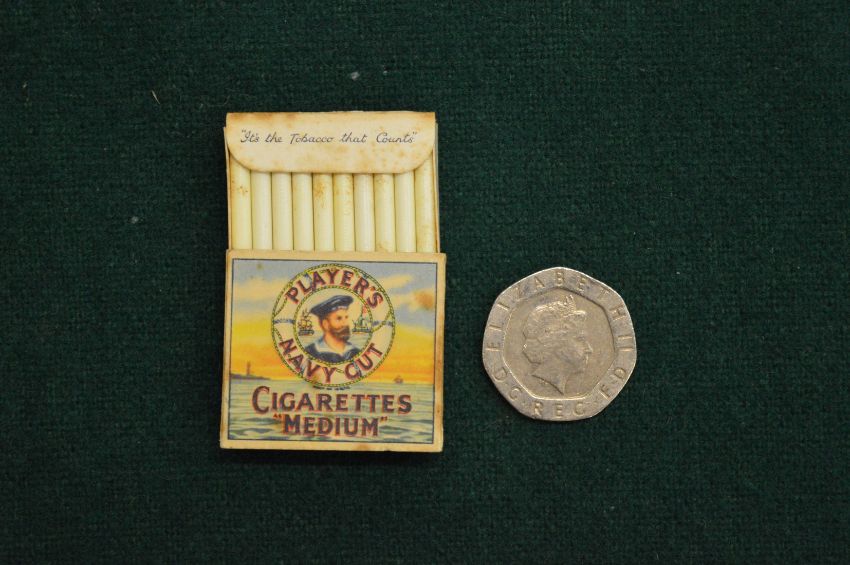 A miniature packet of Players Navy Cut cigarettes.