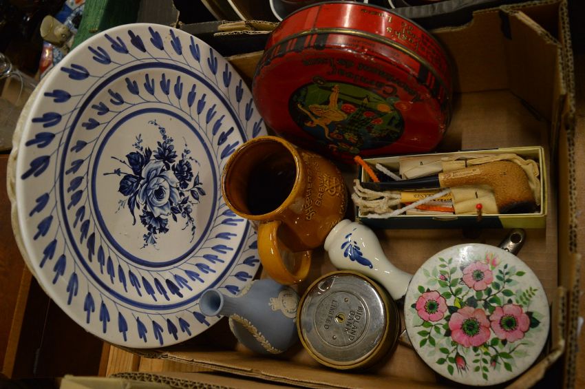 Collectors tins, porcelain plates, a meerschaum pipe etc.