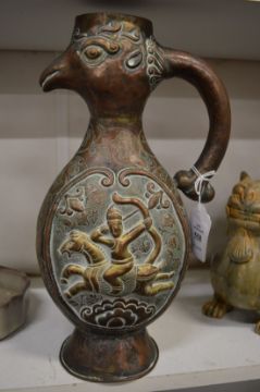 An Islamic embossed copper bird form ewer.