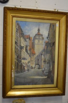 Continental School, view along a street with a clock tower, watercolour and pastel, indistinctly signed.