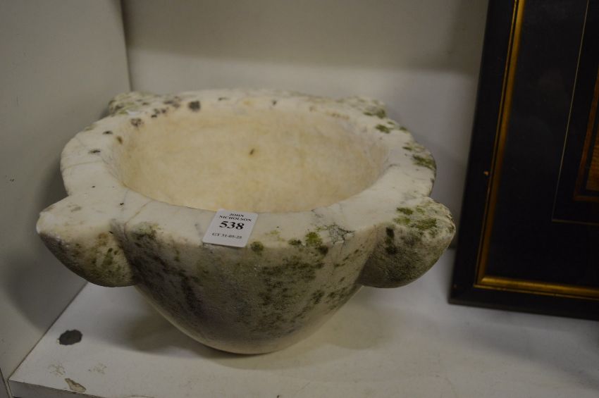 A large weathered marble mortar.
