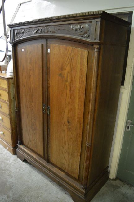 An Art Nouveau oak two door wardrobe (later door panels).