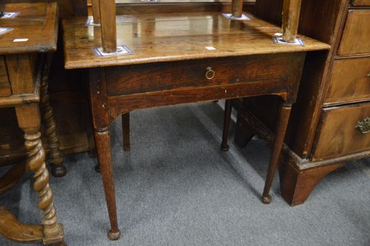 An 18th century oak single drawer side table on turned legs with pad feet.