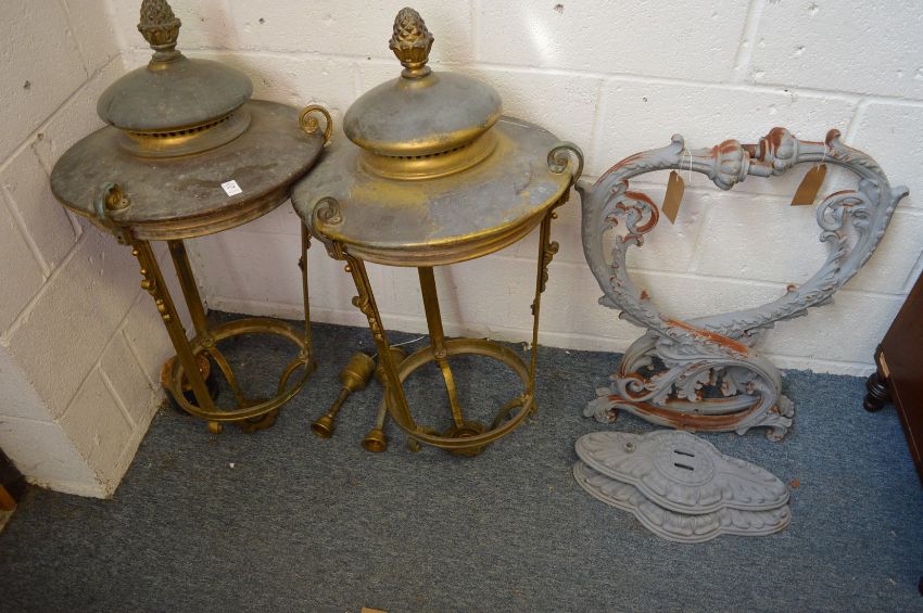 A large pair of bronze lanterns with cast iron brackets,(lanterns lacking glazing).