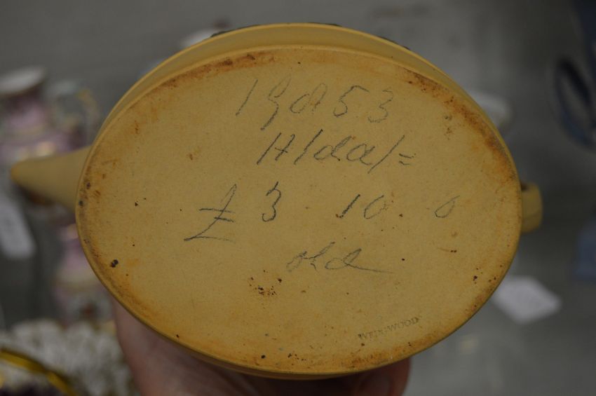 A Wedgwood Caneware teapot, early 19th century decorated in the domestic employment pattern (chip to spout).