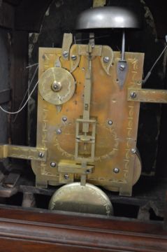 A good Georgian mahogany bracket clock with fusee movement, with strike and repeat mechanism, the repainted dial signed Rivers & Sons, Cornhill, London, the movement engraved with the same name, complete with wall bracket.