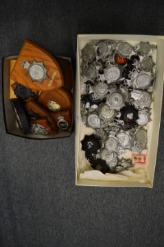 A large collection of police badges, some mounted on plaques.