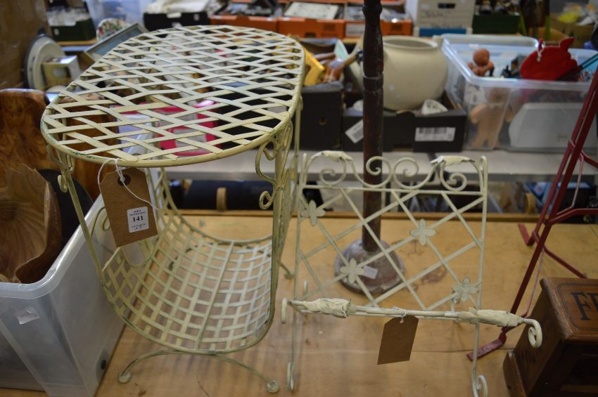 Small wrought iron table, similar folding magazine rack and a candle stand.