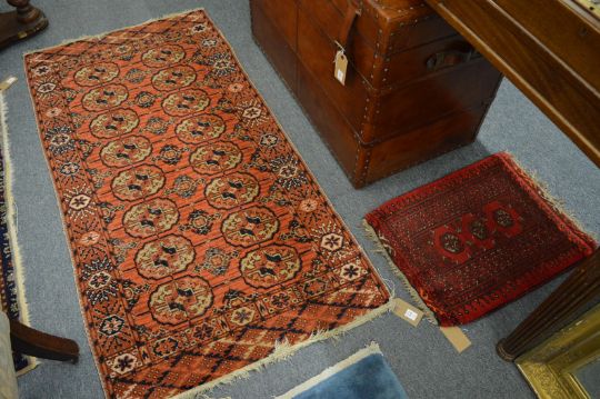 A bokhara style rug, 162cm x 83cm together with a small bokhara style mat, 60cm x 47cm.