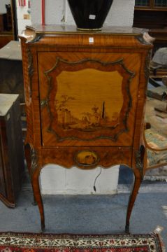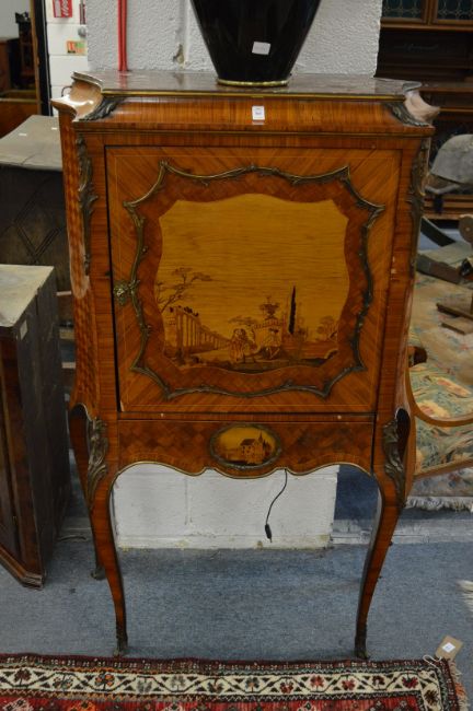 A 19th century French king wood parquetry and marquetry standing cabinet with a panelled door and drawer below, each inlaid with a scene of figures and buildings, the cabinet with marble top and ormolu mounts (marble af).
