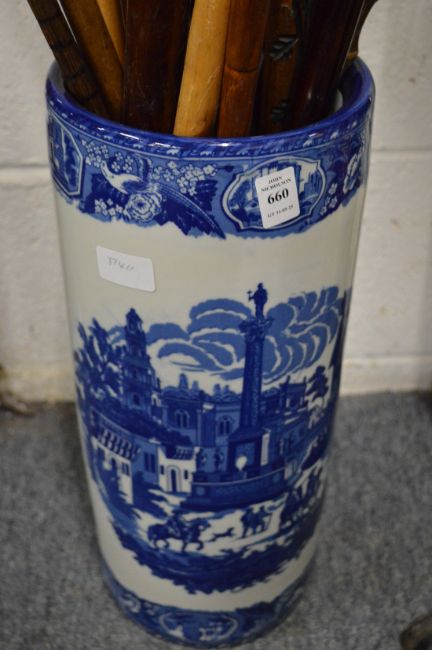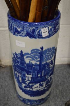 A blue and white stick stand.