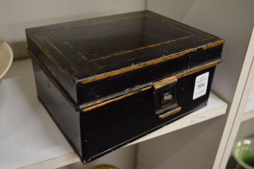 A black Japanned spice tin containing five named compartments.