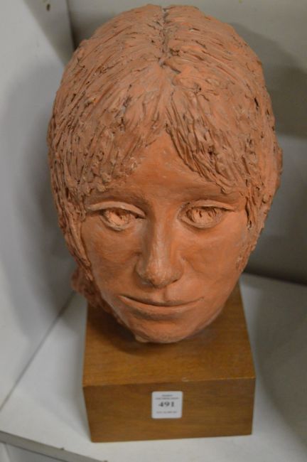 Sally Hurst, a terracotta bust of a women mounted on a wooden plinth.