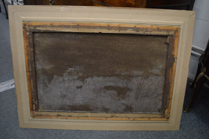 19th century English School, fishermen seated on a bank by a stone bridge, oil on canvas.