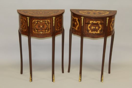 A PAIR OF LOUIS XVITH DESIGN DEMI-LUNE INLAID BEDSIDE CHESTS with three drawers, on slender legs.