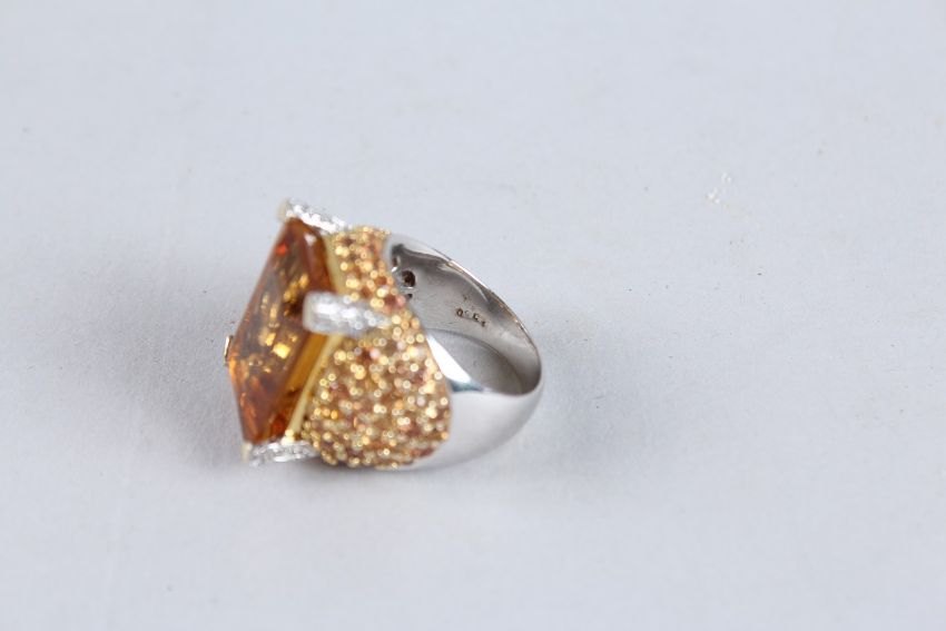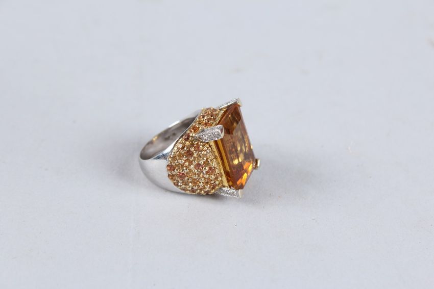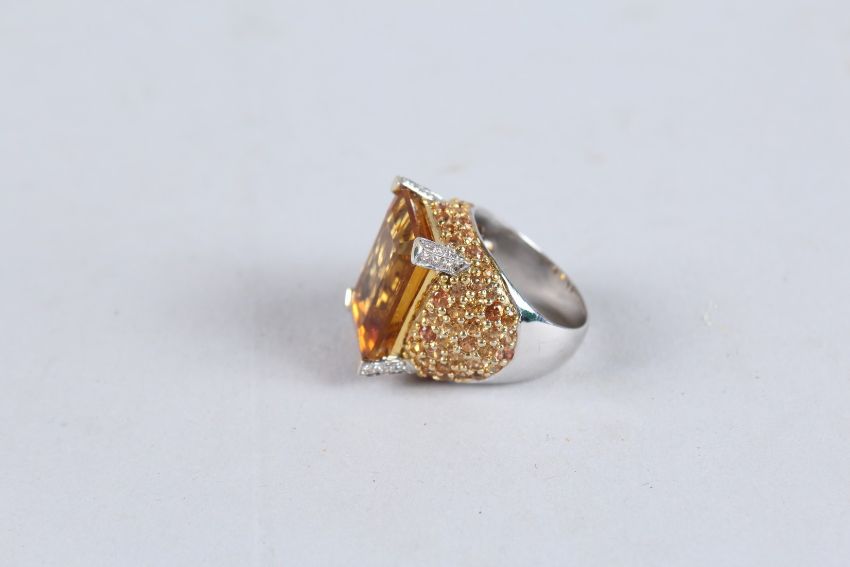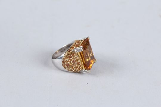 A GOOD 18CT GOLD ORANGE STONE RING with diamond shoulders.