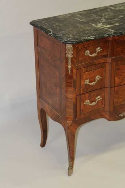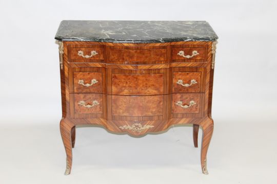A GOOD MARBLE TOP THREE DRAWER COMMODE on curving legs.