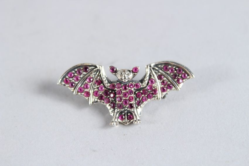 A SILVER AND RUBY SET BAT BROOCH/PENDANT with diamond eyes.