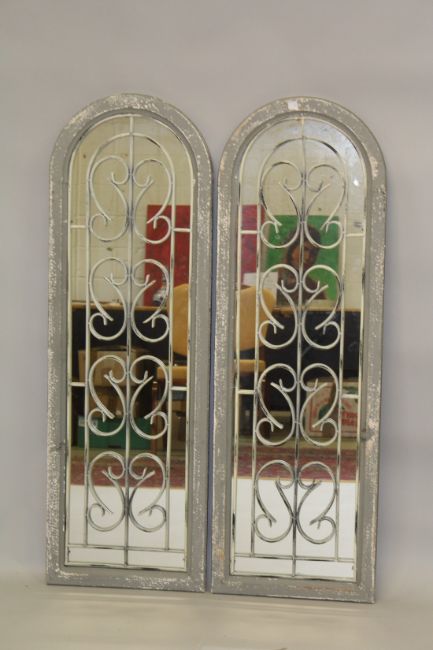 A PAIR OF GREY ARCHED GARDEN MIRRORS.