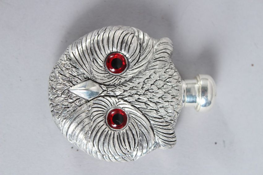 A SILVER PLATED NOVELTY OWL FACE PERFUME BOTTLE.