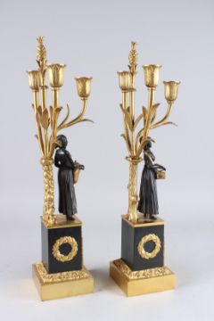 A GOOD PAIR OF REGENCY GILT METAL AND BRONZE CANDELABRA with female figures, each with three scrolling branches.
