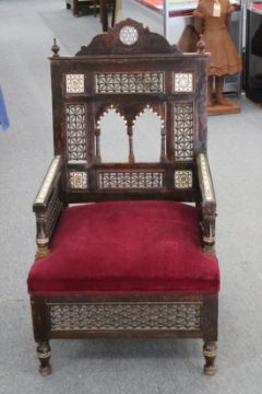 A VERY GOOD PAIR OF ISLAMIC INLAID ARMCHAIRS with parquetry bone and ivory inlay, bobbin turned decoration and padded velvet seats.