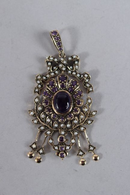 A 9CT GOLD, AMETHYST AND PEARL BOW TOP PENDANT.