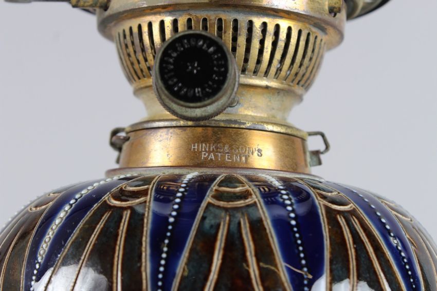 A VERY GOOD DOULTON LAMBETH STONEWARE OIL LAMP with gilt metal mounts and shade.