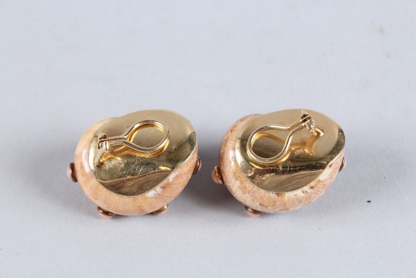 A PAIR OF 14CT GOLD AND SHELL EARRINGS.