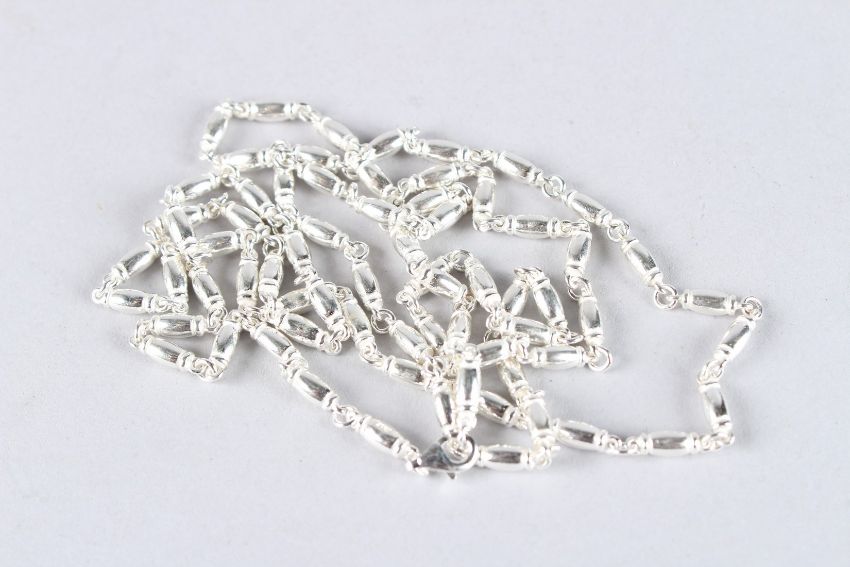 A STERLING SILVER LONG FANCY NECKLACE.