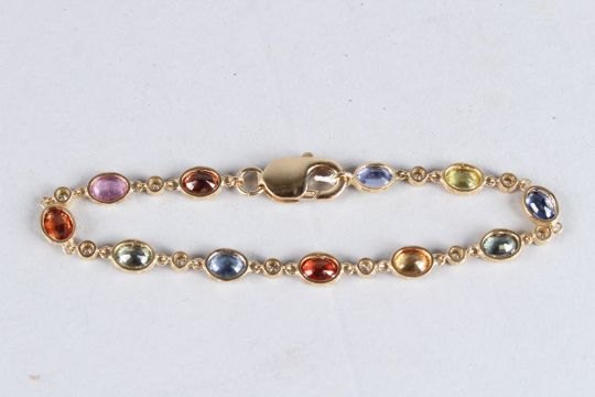 AN 18CT GOLD AND MULTI-COLOURED SAPPHIRE AND DIAMOND LINE BRACELET.