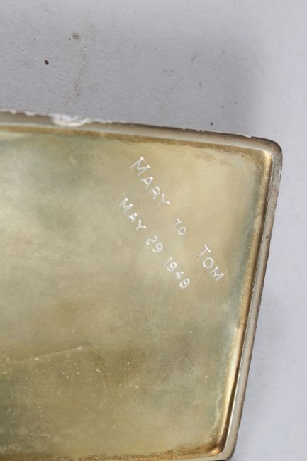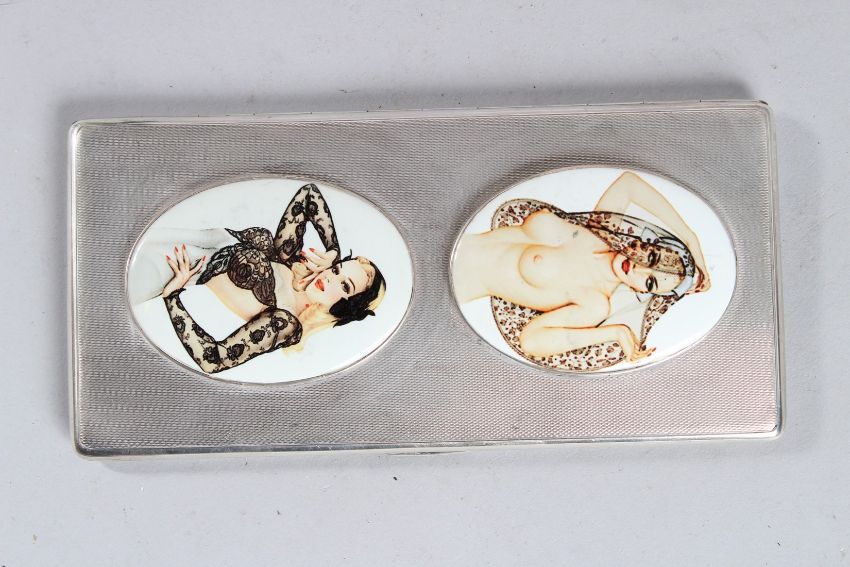 7ins x 3.25ins. Birmingham 1948, set with two oval glamour model plaques.
