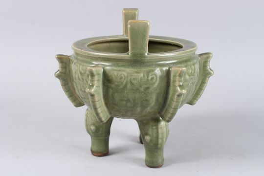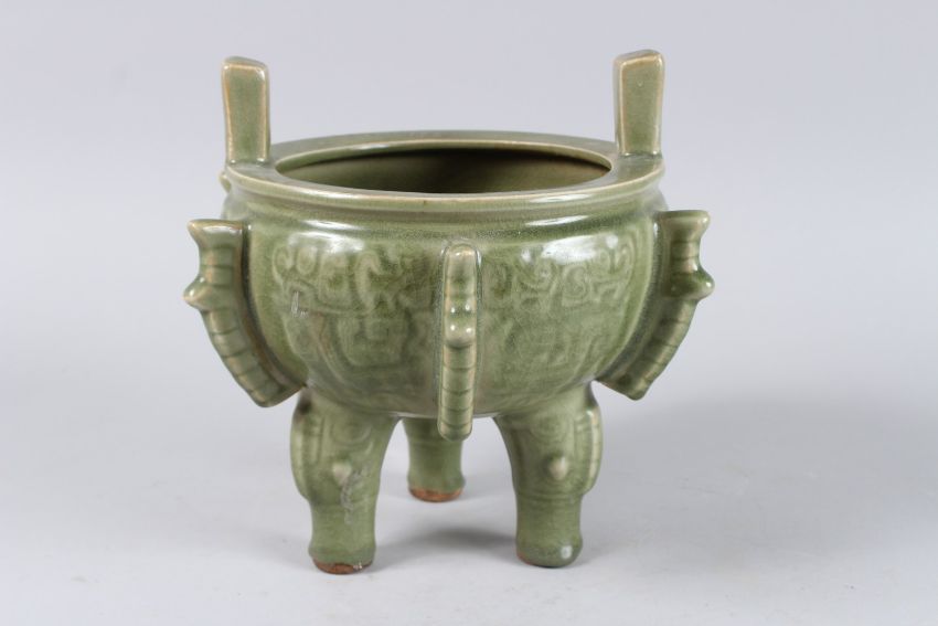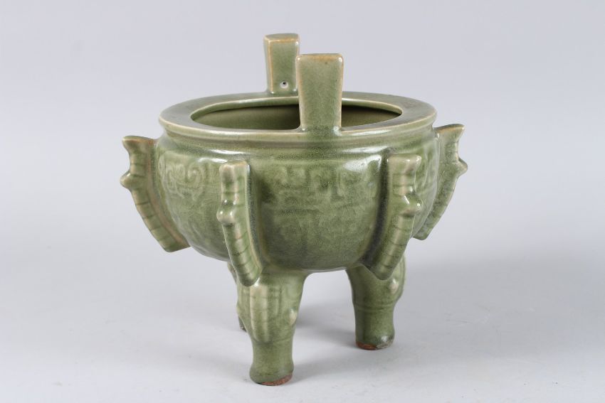 A CHINESE GREEN GLAZED CIRCULAR CENSER on three legs.