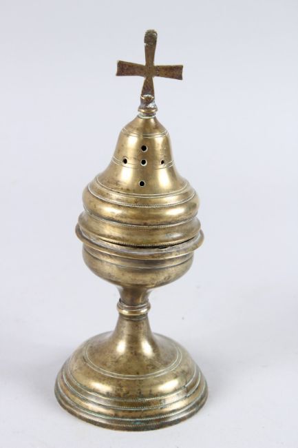A CONTINENTAL BRASS RELIGIOUS VESSEL with cross finial.