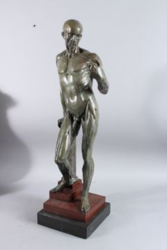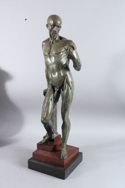 A VERY GOOD BRONZE ANATOMICAL MAN nude standing bedside a pillar, on a marble base.