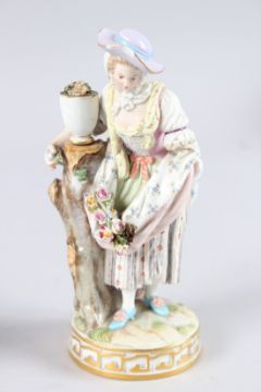 TWO 19TH CENTURY MEISSEN FIGURES, a young girl with a dog and mirror, 5.5ins high, and a young lady standing beside a pillar, 6.5ins high.